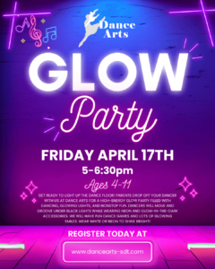 Parents drop off your dancer with us at Dance Arts for a high-energy Glow Party filled with dancing, glowing lights, and nonstop fun.